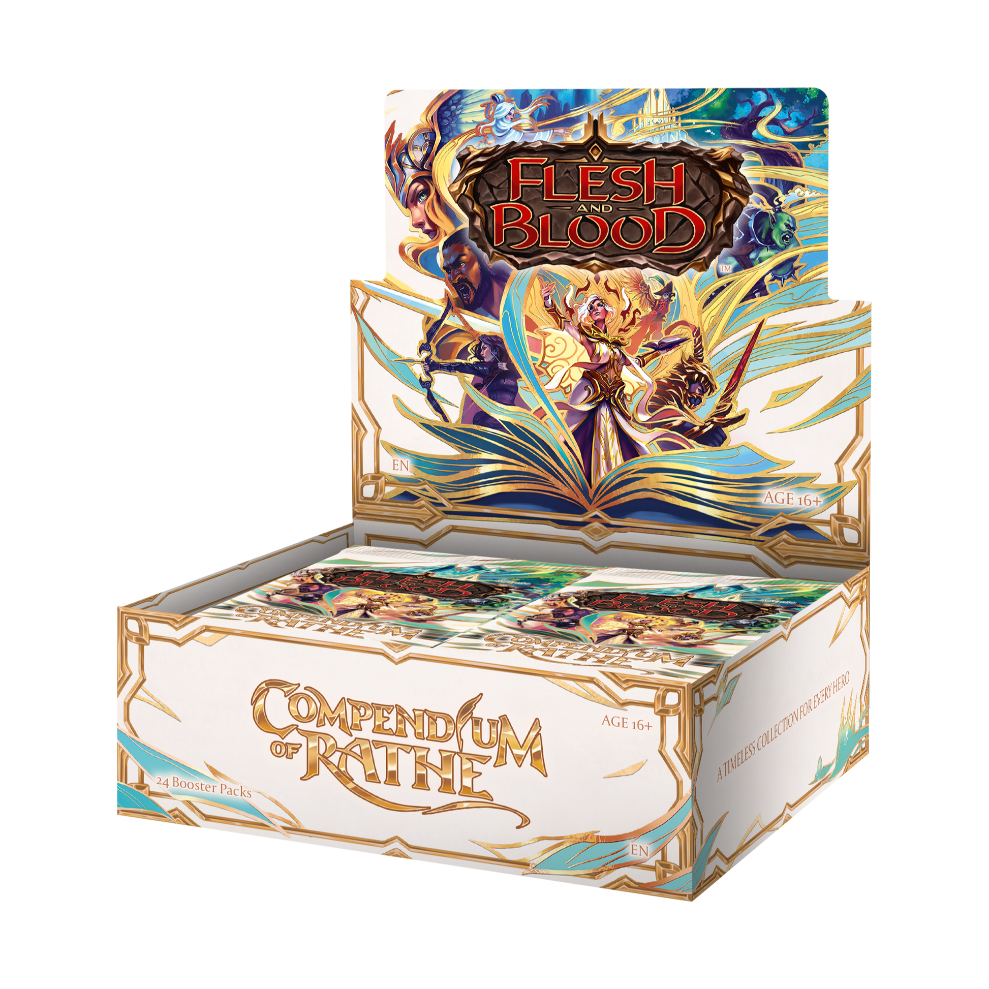 Compendium of Rathe is a premium booster set featuring support for every hero, class, and talent in Flesh and Blood! A homage to game's growing history, it sees fan-favorite mechanics, iconic cards, and strategies from the past revisited and reimagined for the modern era.