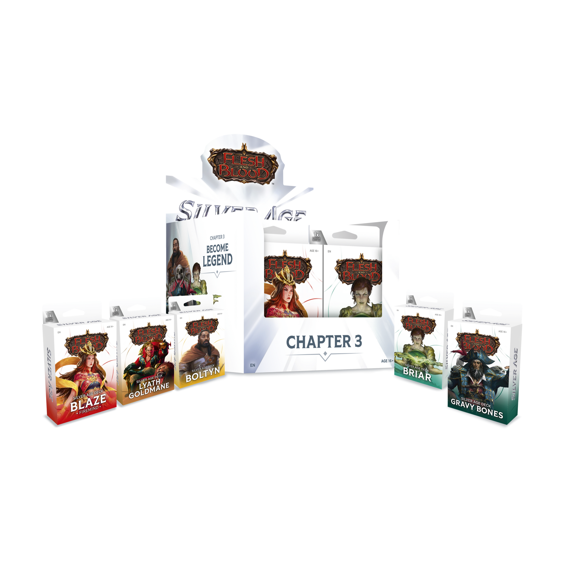Become a legend with Silver Age Chapter 3! Silver Age is an entirely new, affordable way to play Flesh and Blood, using only common, rare, and basic cards alongside iconic young heroes. Games are fast, fun, and friendly on the wallet!