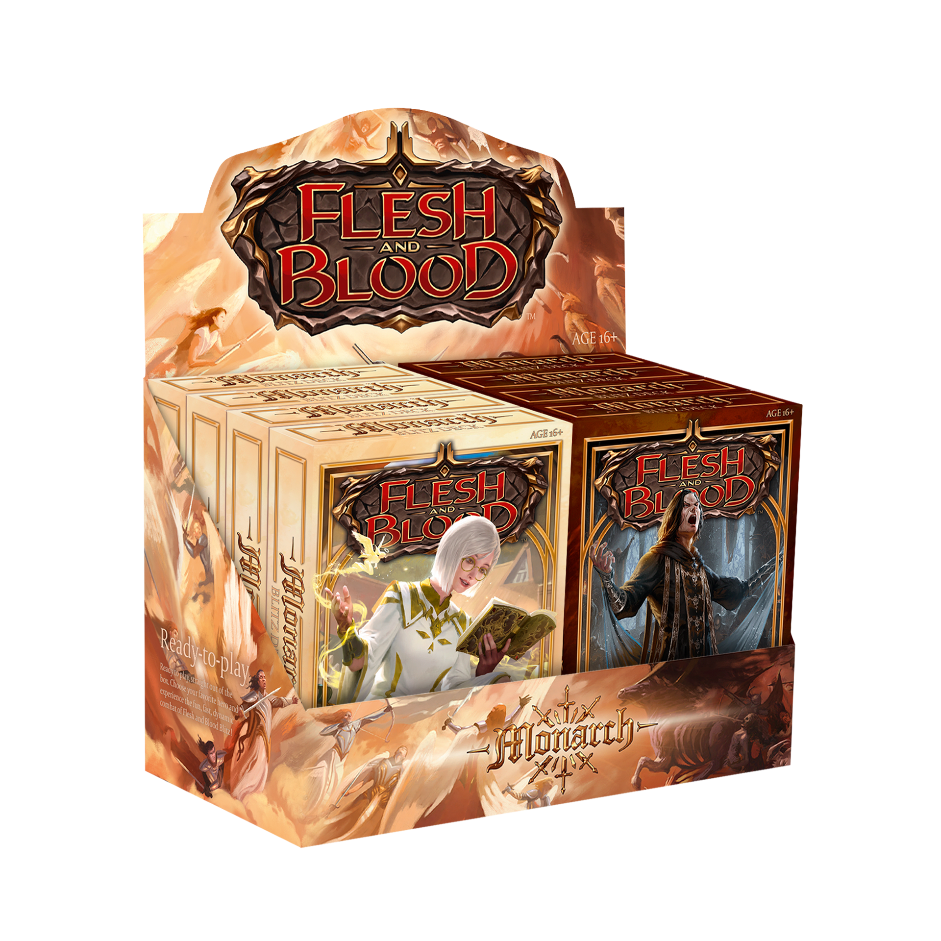 Ready-to-play out of the box, Monarch Blitz decks are designed to be a perfect introduction to Flesh and Blood, and suitable for new and experienced players alike. This display contains two copies of each of the four Monarch Blitz Decks. Each Monarch Blitz Deck contains an exclusive Rainbow Foil Young Hero card along with weapon, equipment, and Mentor cards, in addition to the 40-card deck.